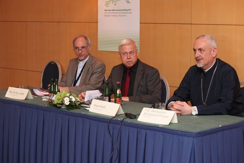 Budapest – Miért fontos az Európai Egyházak Konferenciájának (CEC) 14. nagygyűlése? Erről tartottak rövid sajtótájékoztatót 2013. július 2-án Budapesten, a Hélia szállóban Emmanuel francia metropolitának, a CEC elnökének és Guy Liagre-nak, a szervezet főtitkárának, valamint Klaus Riethnek, a németországi württembergi evangélikus egyház főtanácsosának részvételével. Forrás: reformatus.hu, szöveg: Kováts Annamária, fotó: Sereg Krisztián