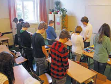 Az egyik ilyen rendszer, hogy az első órát imádsággal kezdjük. Ez persze nem olyan könnyű, mint gondolnánk, hiszen a nyolcadikosok, főleg a fúk, gyakran esnek be éhesen az első órára, és a kialakult áhítatos csendben nehéz nem a szendvicsre gondolni; aztán majd mindjárt megkérdezi valaki, hogy megeheti-e, és nagyon reméli, hogy a tanárnő megengedi, amilyen könnyen rávehető ilyesmire.